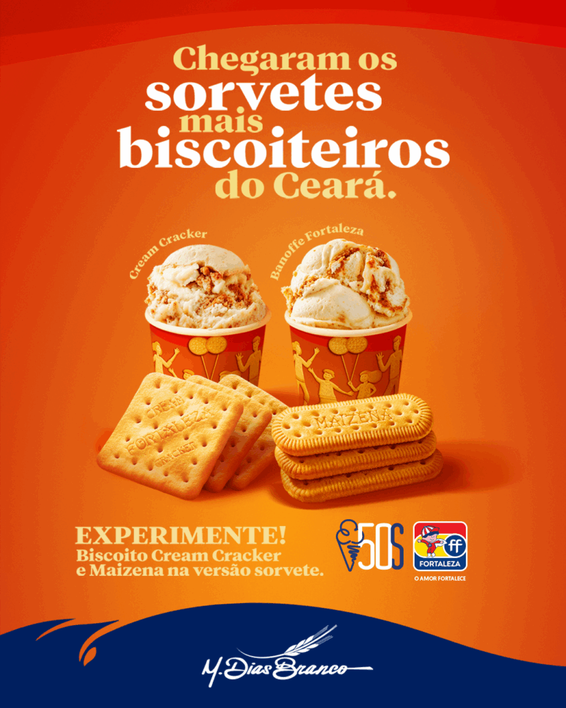 A Fortaleza, primeira marca da M. Dias Branco nascida no Ceará e reconhecida por sua tradição, se une à tradicional sorveteria cearense 50 Sabores para lançar duas criações exclusivas que transformam biscoitos clássicos em sobremesas geladas: Banofee Fortaleza e Sorvete de Cream Cracker. A campanha “Chegaram os sorvetes mais biscoiteiros do Ceará”.