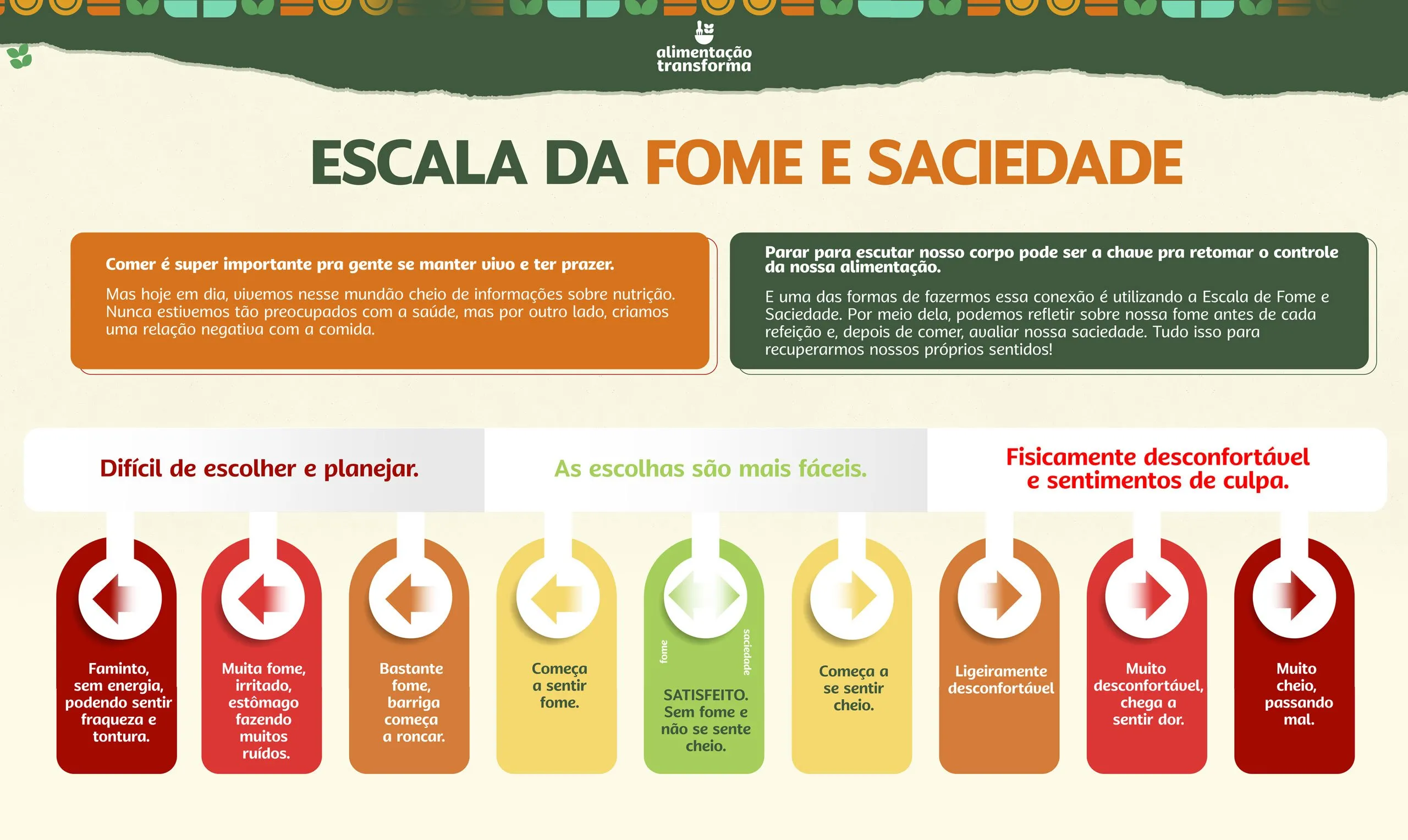 O retângulo posicionado à direita é verde e traz o seguinte texto em branco: “Parar para escutar nosso corpo pode ser a chave para retomar o controle da nossa alimentação. E uma das formas de fazermos essa conexão é utilizando a Escala de Fome e Saciedade. Por meio dela, podemos refletir sobre nossa fome antes de cada refeição e, depois de comer, avaliar nossa saciedade. Tudo isso para recuperarmos nossos próprios sentidos!​”