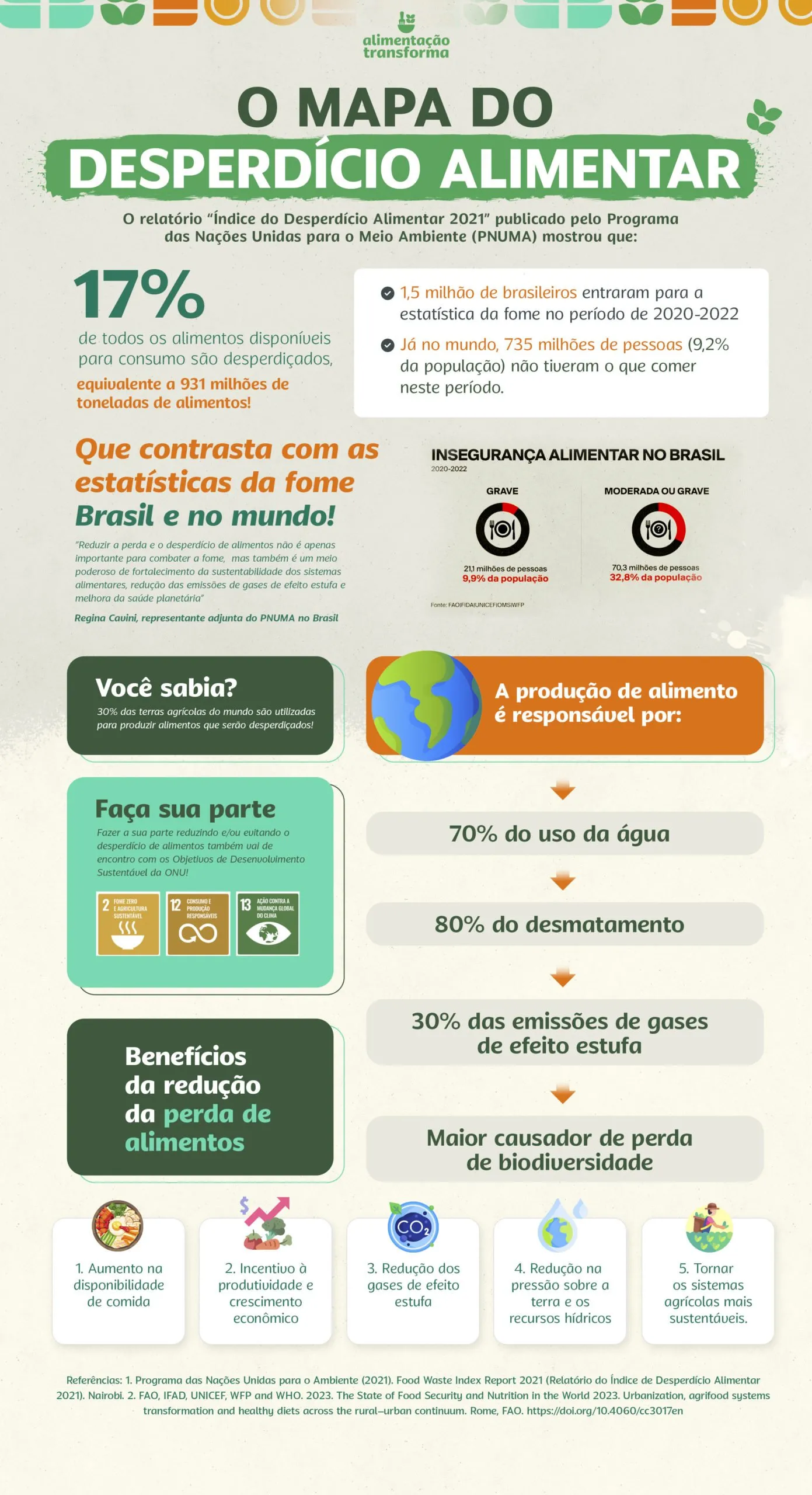 - Citação de Regina Cavini, representante adjunta do PNUMA no Brasil: “Reduzir a perda e o desperdício de alimentos não é apenas importante para combater a fome, mas também é um meio poderoso de fortalecimento da sustentabilidade dos sistemas alimentares, redução das emissões de gases de efeito estufa e melhora da saúde planetária”.