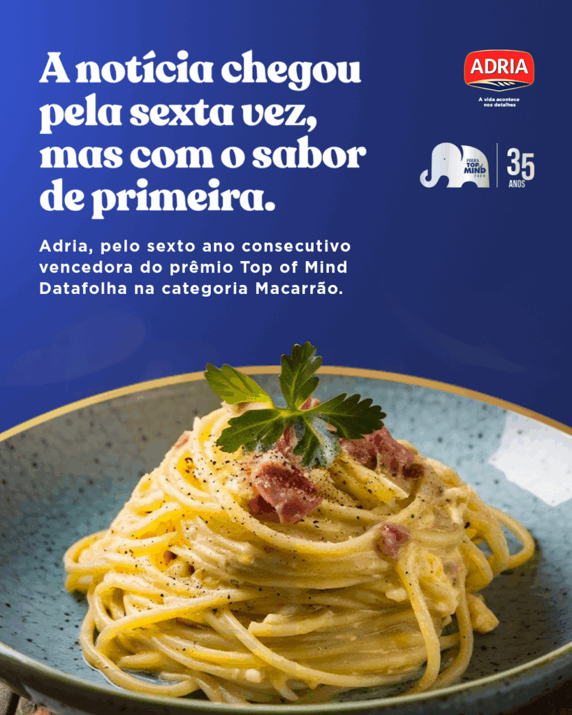 A Adria, referência em massas, biscoitos e torradas, é reconhecida pela sexta vez consecutiva como Top of Mind pelo Instituto Datafolha, na categoria Macarrão. A pesquisa é considerada referência em lembrança de marca e reforça a liderança de Adria, que no próximo ano completa 75 anos cuidando de cada detalhe quando o assunto é estar na mesa dos brasileiros.