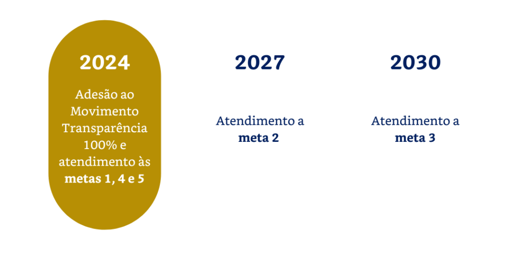 No ano de 2023, ampliamos nosso compromisso no Pilar Governança estabelecendo 08 novas metas públicas, que envolvem temas diversos que vão além das obrigações legais e regulamentares exigidas, dentre elas, está a adesão ao Movimento Transparência 100%.