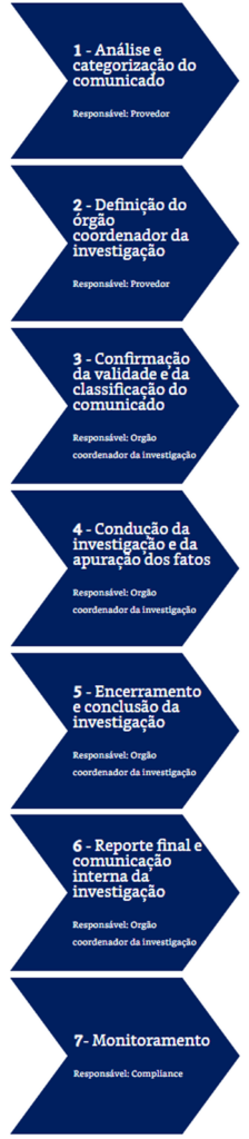 Os comunicados coletados pela empresa independente são encaminhados para a área de Compliance ou para outros órgãos responsáveis. Após conclusão do processo investigativo, se cabíveis, são aplicadas medidas disciplinares ou recomendadas melhorias de processos. O estágio da apuração é atualizado ao comunicante por meio da plataforma do Canal Ético.
