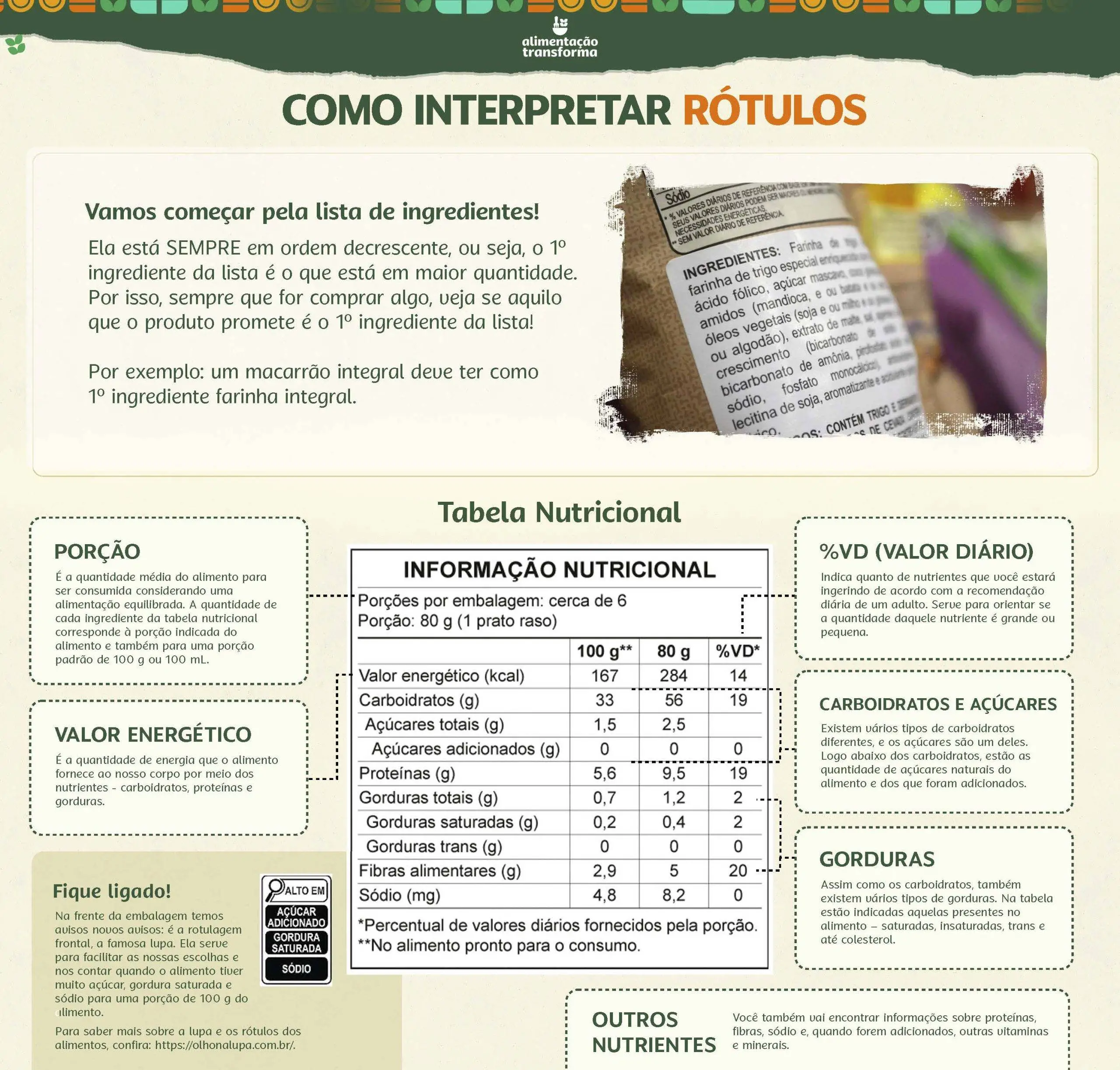 “Na frente da embalagem temos novos avisos: é a rotulagem frontal, a famosa lupa. Ela serve para facilitar as nossas escolhas e nos contar quando o alimento tiver muito açúcar, gordura saturada e sódio para uma porção de 100 g do alimento pronto para consumo.”