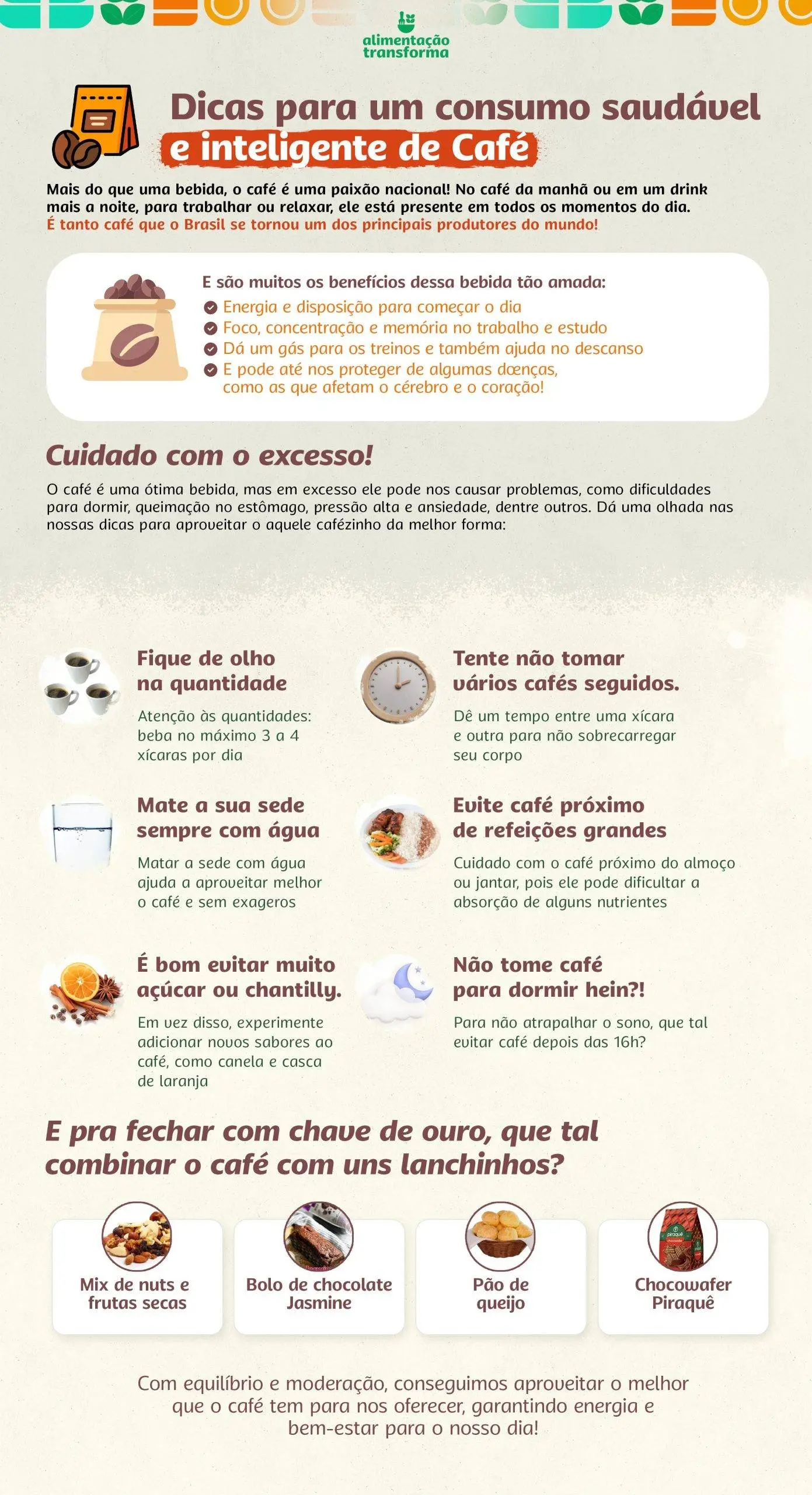 Por fim, o infográfico encerra com a seguinte frase: “Com equilíbrio e moderação, conseguimos aproveitar o melhor que o café tem para nos oferecer, garantindo energia e bem-estar para o nosso dia!”.