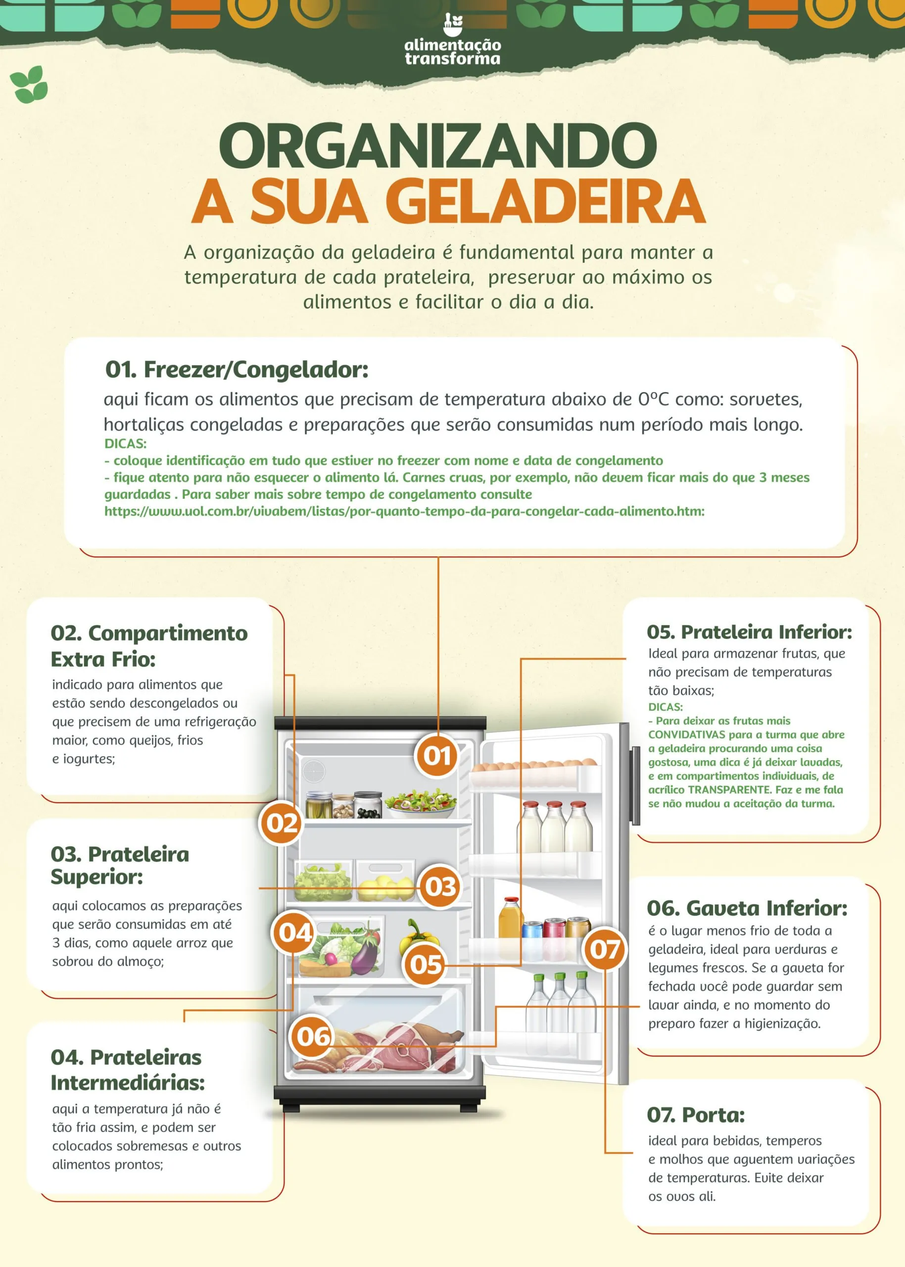 Abaixo do título tem um pequeno texto: “A organização da geladeira é fundamental para manter a temperatura de cada prateleira, preservar ao máximo os alimentos e facilitar o dia a dia”.