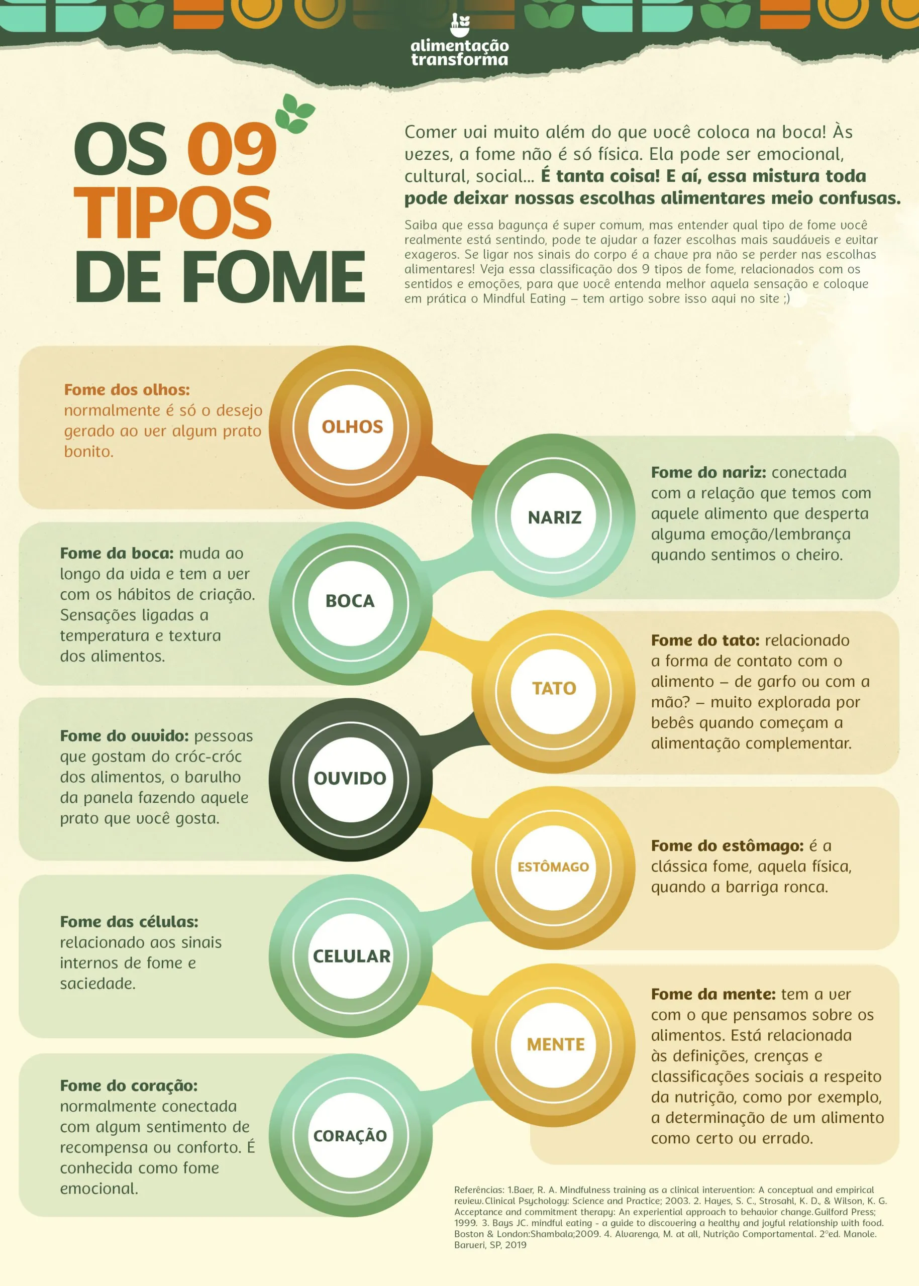 O segundo texto, em uma fonte menor que o primeiro, é o seguinte: “Saiba que essa bagunça é super comum, mas entender qual tipo de fome você realmente está sentindo, pode te ajudar a fazer escolhas mais saudáveis e evitar exageros. Se ligar nos sinais do corpo é a chave pra não se perder nas escolhas alimentares! Veja essa classificação dos 9 tipos de fome, relacionados com os sentidos e emoções, para que você entenda melhor aquela sensação e coloque em prática o Mindful Eating – tem artigo sobre isso aqui no site”.